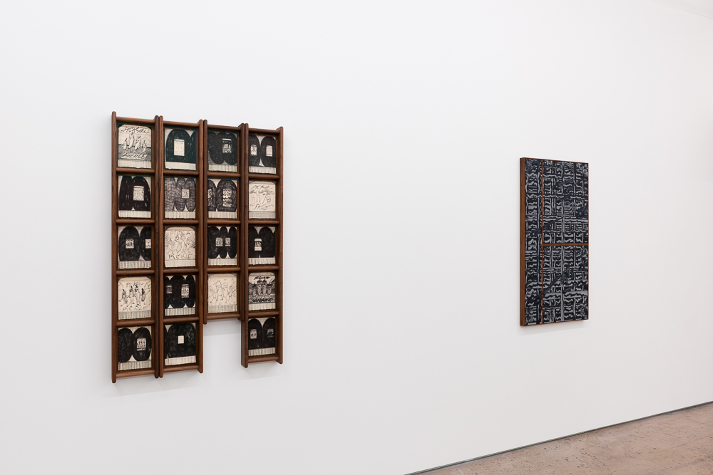 ink on paper, walnut, museum glass