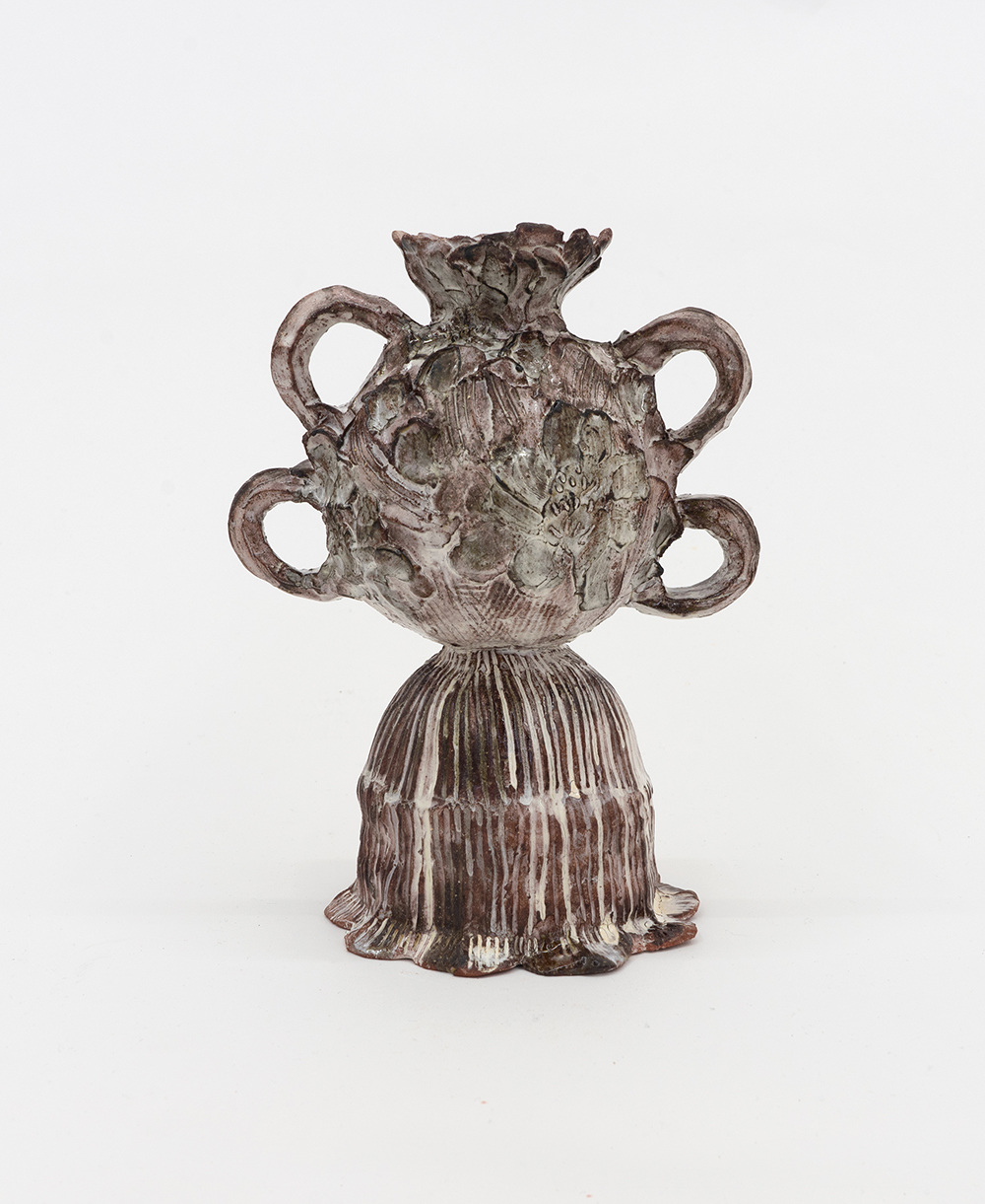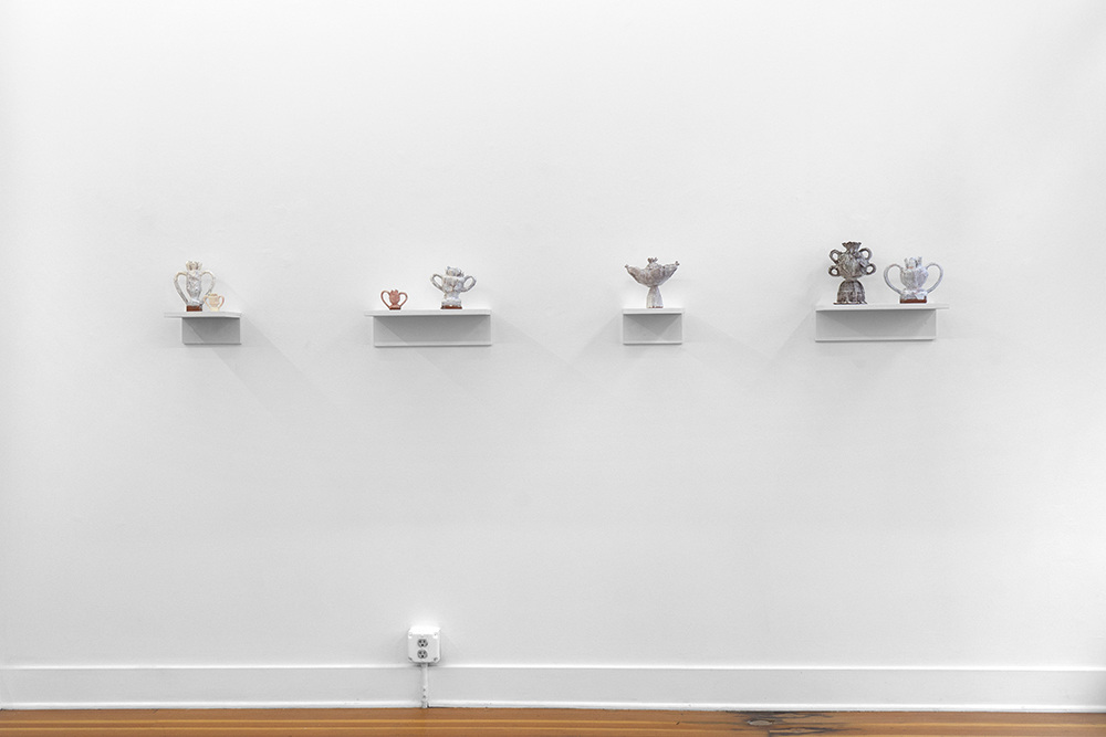 Initially borne of explorations in collage and clay, Bloom has reimagined the trophy form—traditionally a symbol of victory and a marker of elite status—as a site embedded with intensely personal questions about achievement and recognition. In the group of works on view at Adams and Ollman, Bloom continues these investigations as she highlights the intersections of acknowledgment and invisibility, success and failure, internal dialogue and public perception. The comforts of repetition—found both in the sculptures’ recurrent forms and textures—and the domestic associations of floral and shell-like motifs are subverted by imperfections and irregularities. Petal-shaped crowns teeter uncertainly upon towers of organic bulges, collars marked with uneven, hand-drawn lines, and resolute but misshapen pedestals. Others wear loosely and lovingly shaped floral discs upon the soft valleys and precarious sags of their bodies, as though they are at odds with the attention drawn by their decoration.