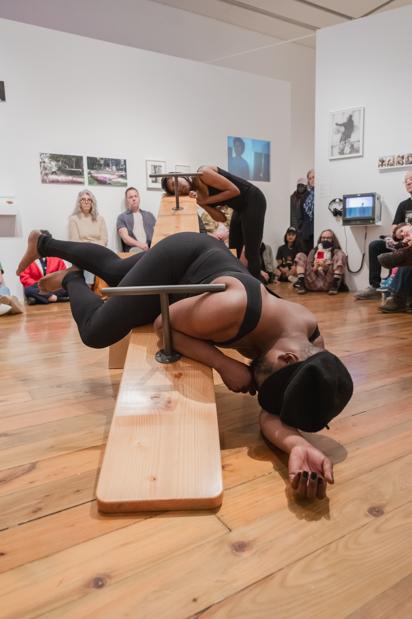 Senga Nengudi, See-See Riders (2024), performance for two dancers, choreographed by Senga Nengudi; commissioned by the Cooley Gallery, Reed College. Pictured: performers keyon gaskin and Sidony O'Neal and art historian Leslie King Hammond