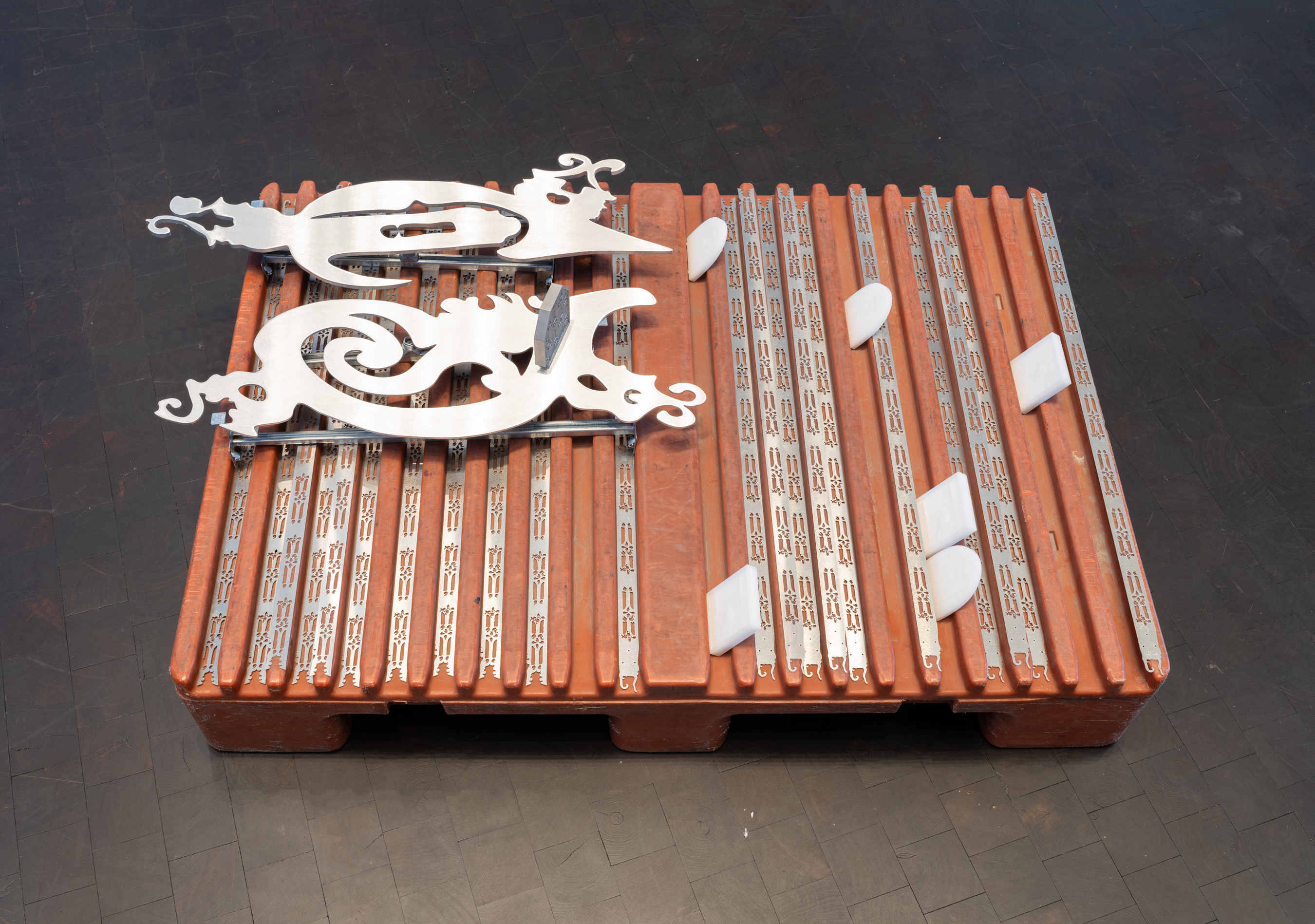 Sidony O’Neal, Program for fireback with sacrificial anode, 2023, Pallet, aluminium, steel, printed inconel, vapor smoothed TPU-70ALWT: That is the thing about math. My experience is that it rarely folds. I admire it as a universal language—I see math as a scaffolding of shared understanding.