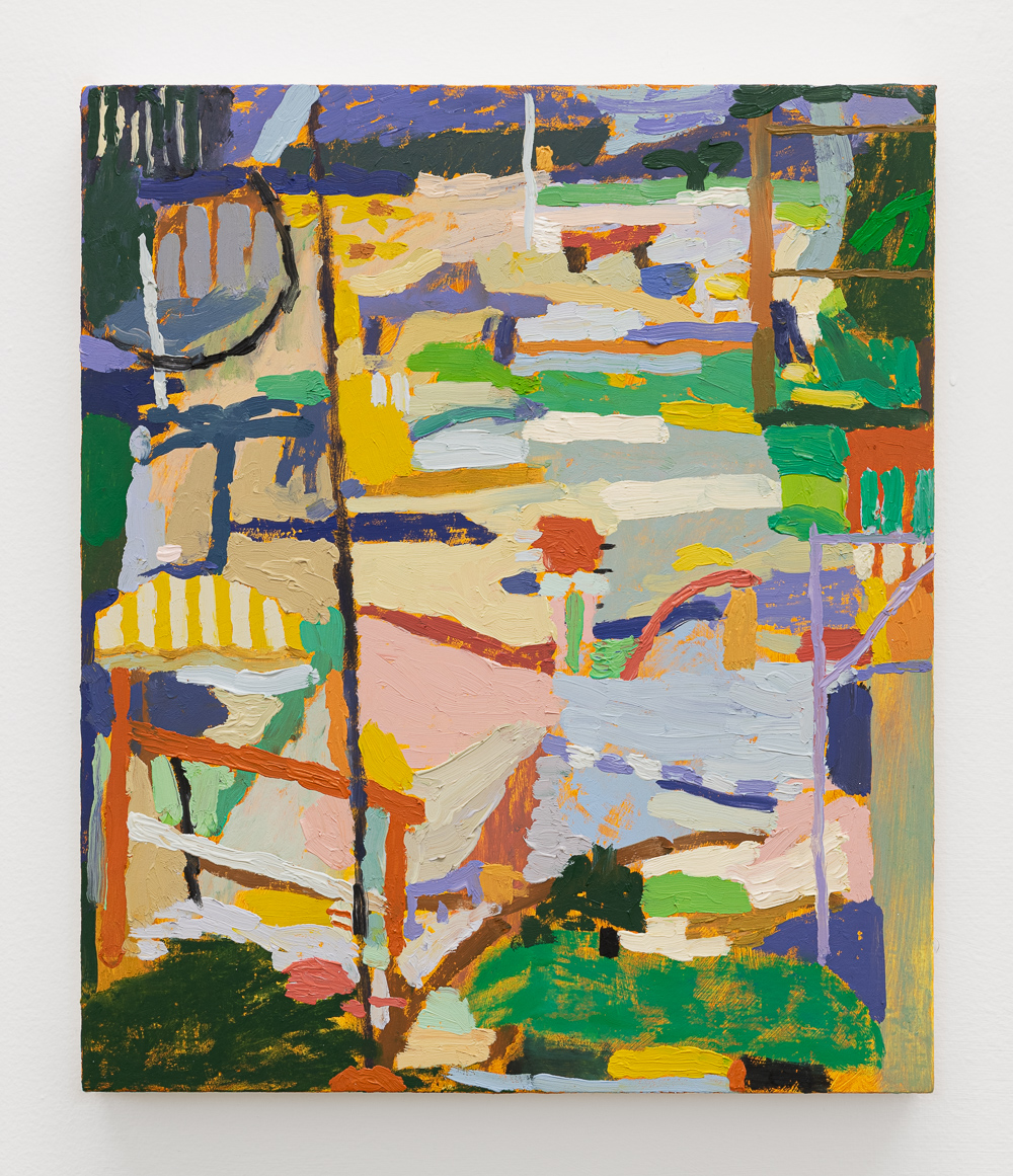 Marked by dense accumulations of vibrant color, impasto paint and gestural marks, each work contains allusions to the images and notations that represent the iconography of the American road trip: streams, seas, fences, patches of grass, flowering bushes, sun hats, palm fronds, meadows, mountains, sand banks and birthday cakes. Within each canvas, shifting views glimpsed through multiple car windows and camera lenses are condensed into the picture plane, allowing the long road, seasonal changes, wide-ranging activities and encounters and myriad places to collapse into a single image.