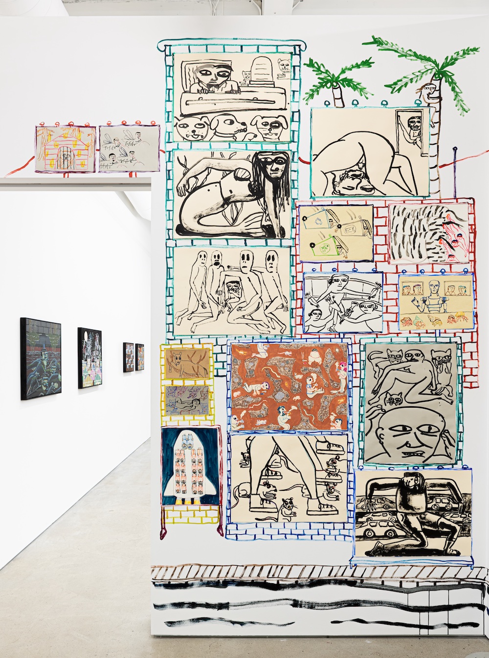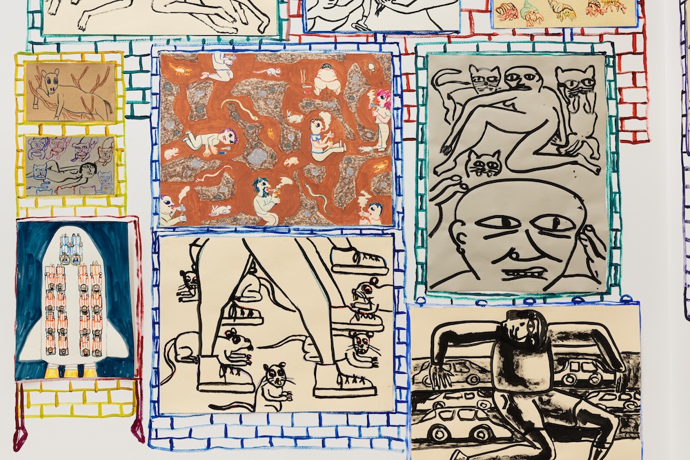 Accompanying the paintings is a collection of drawings that also mine popular culture, myth, and motifs. Composed of ink, watercolor, wax pastels, and graphite, these quick and confident drawings isolate characters, objects, and moments to create chimerical vignettes that are both strange and familiar, resulting in a rich display of world-building that forefronts experimentation, curiosity, and empathy. A large-scale, site specific drawing will extend the works onto the gallery walls and further activate the space.
