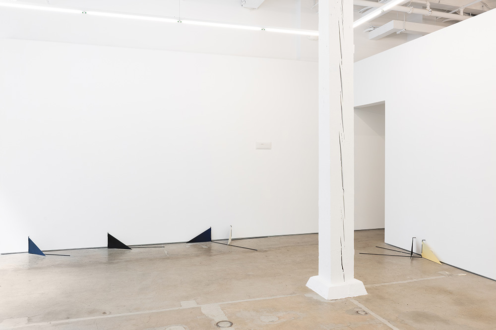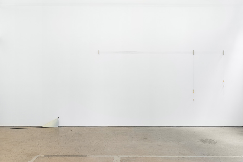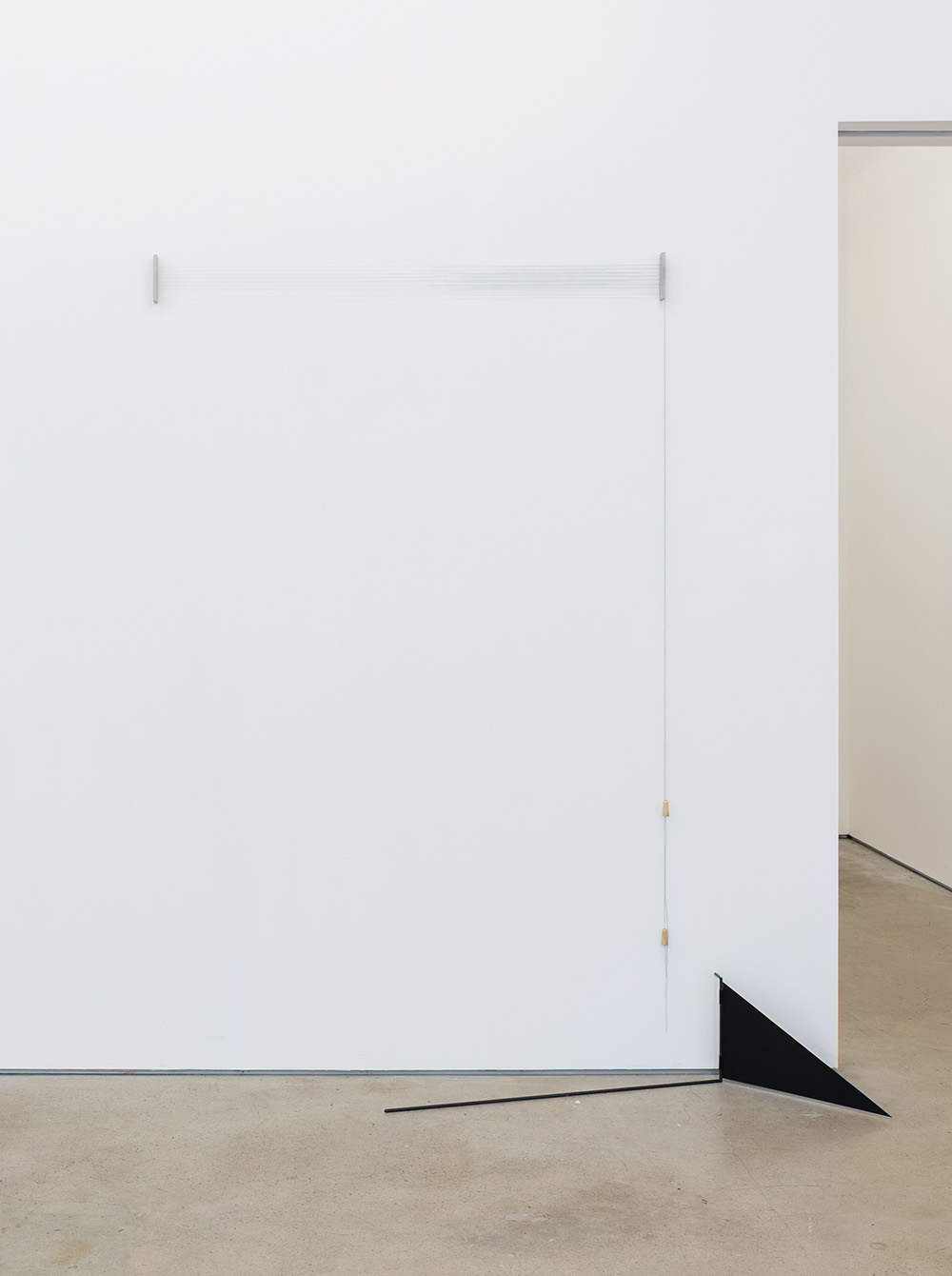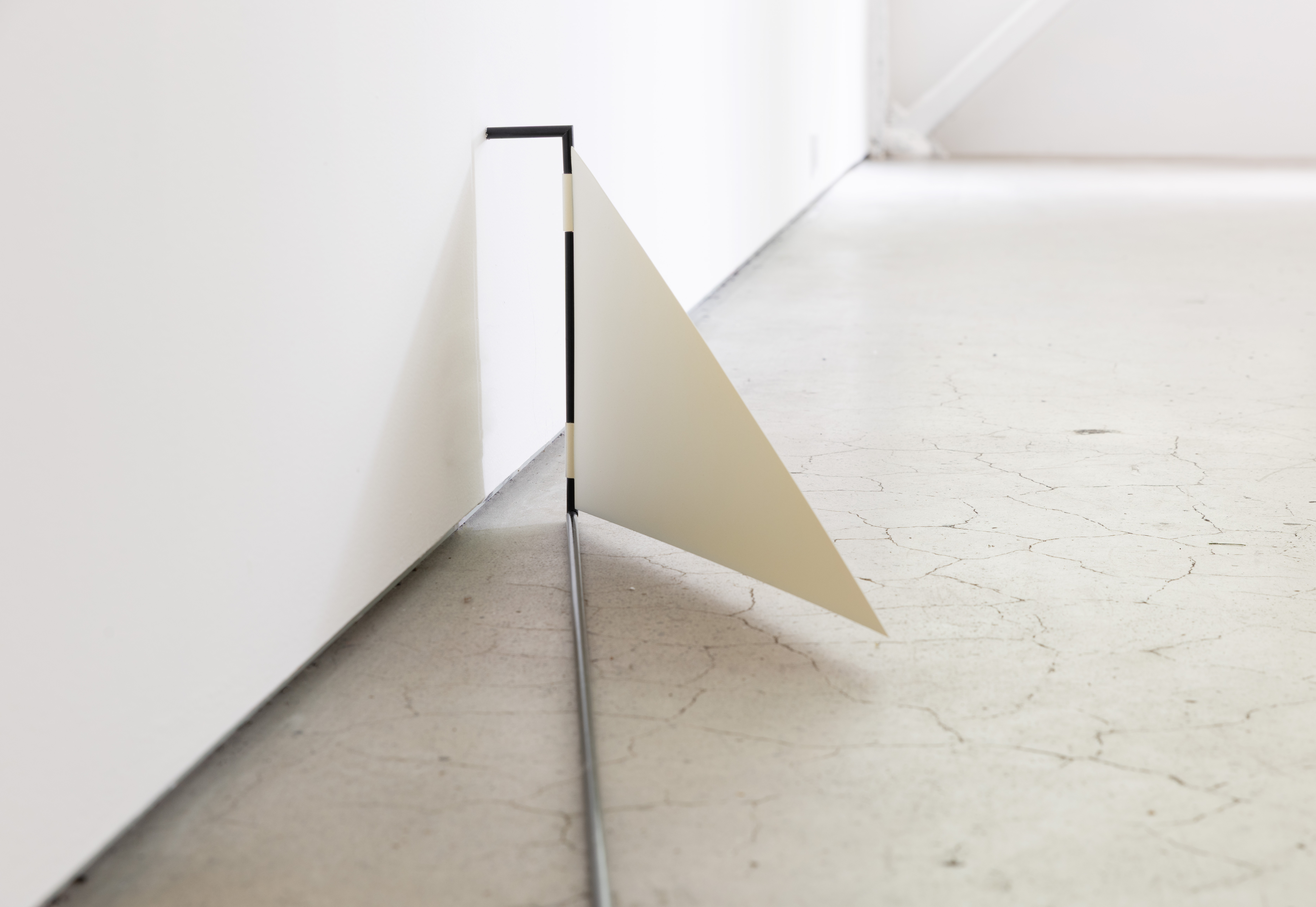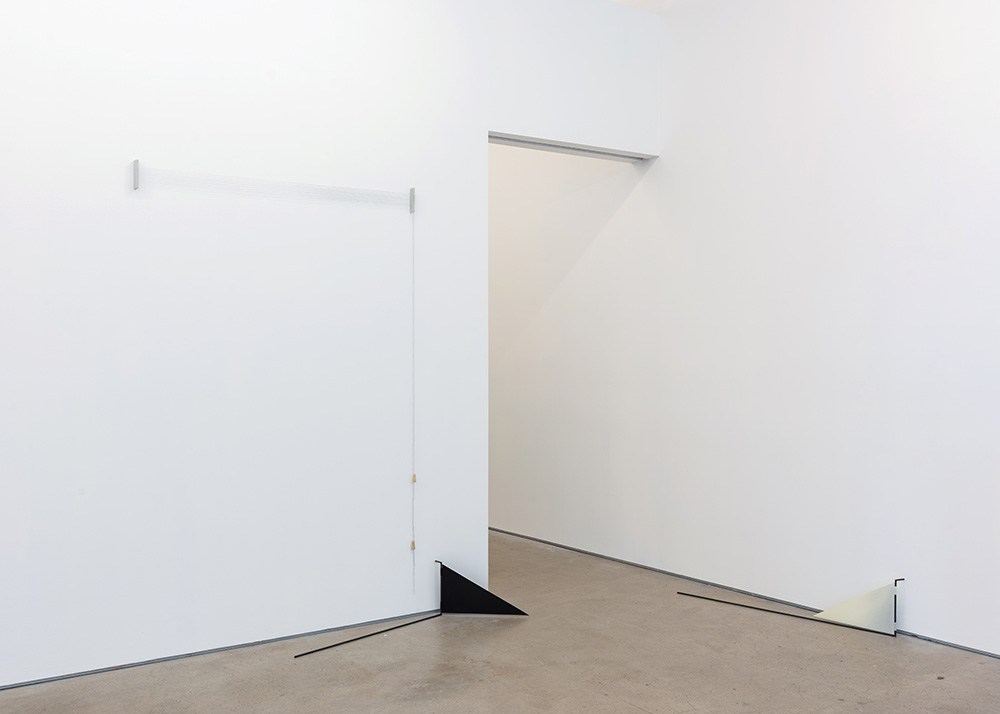 Untitled (sails) are floor-based sculptures made from aluminum, brass, paint, charcoal powder, graphite powder, and fiberglass. Triangles set on a vertical axis, they evoke a sundial, a cast shadow, a flag, or the edge of a door held ajar. Untitled (trace), comprised of cement, hand-worked thread, and brass, reads like a poetic stanza; its lines extending across walls like a musical staff, strings of an instrument, a stretch of sky, or the movement of blinds. Untitled (figure), made of carved plaster, implies a vent — the lungs of a room mid-breath.