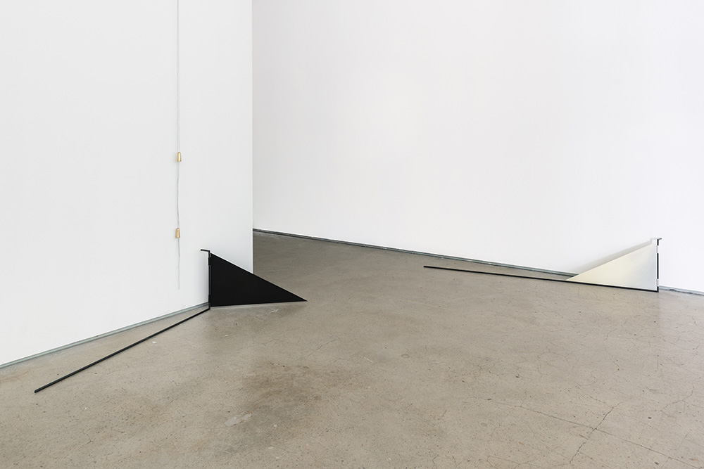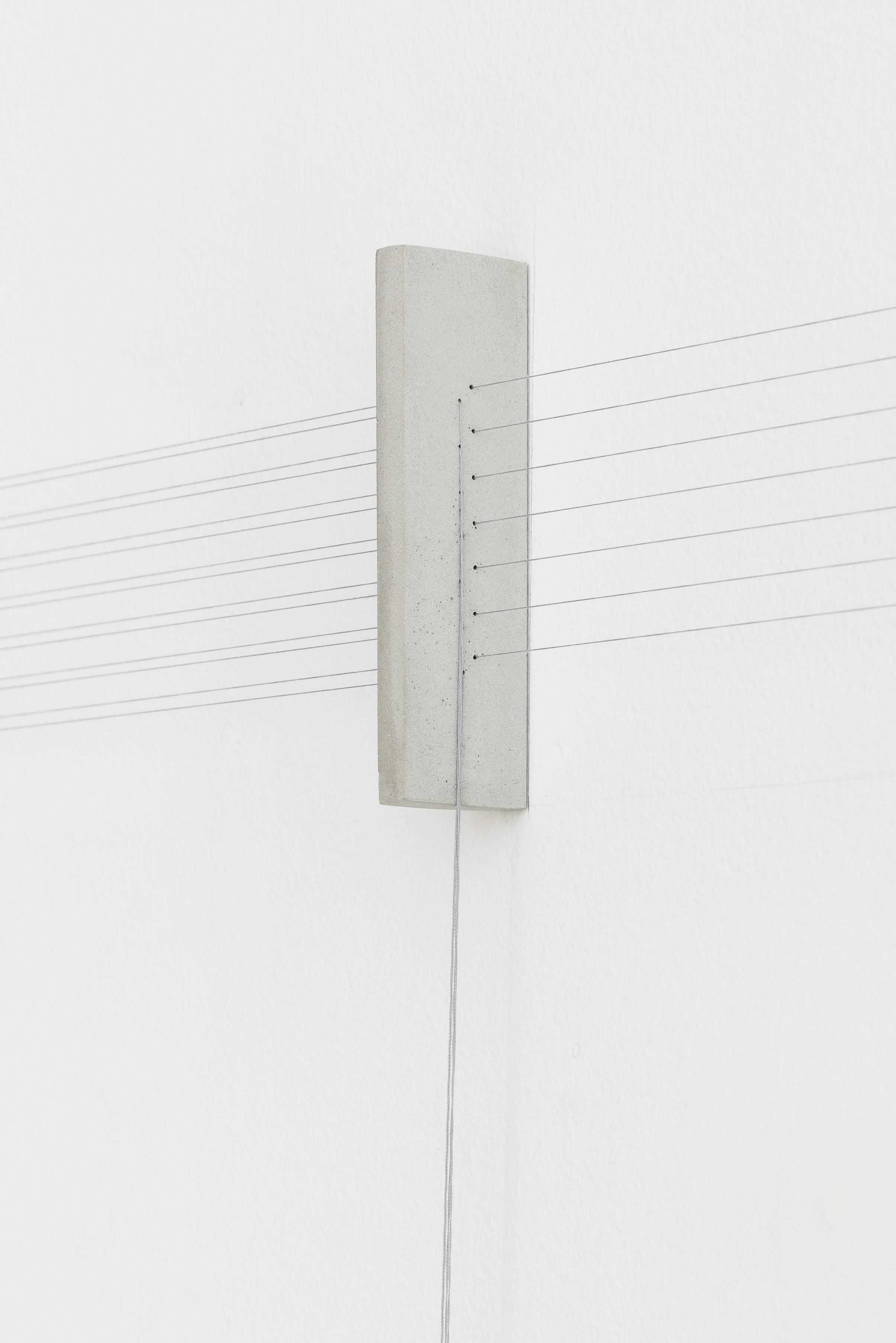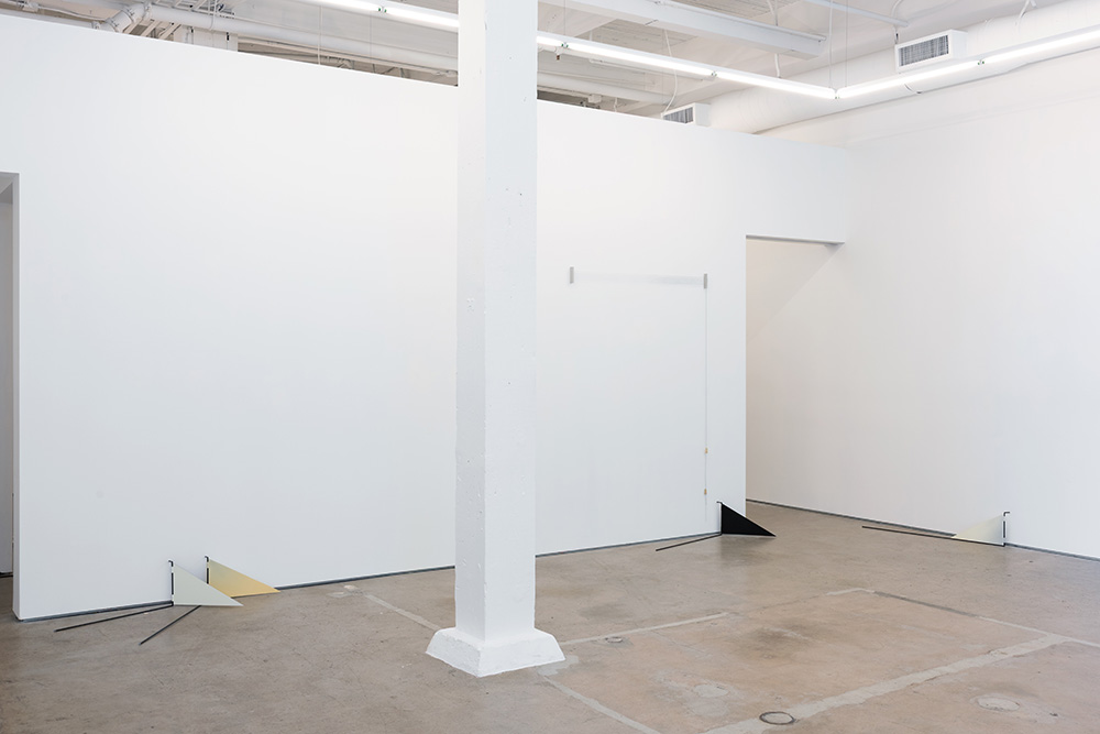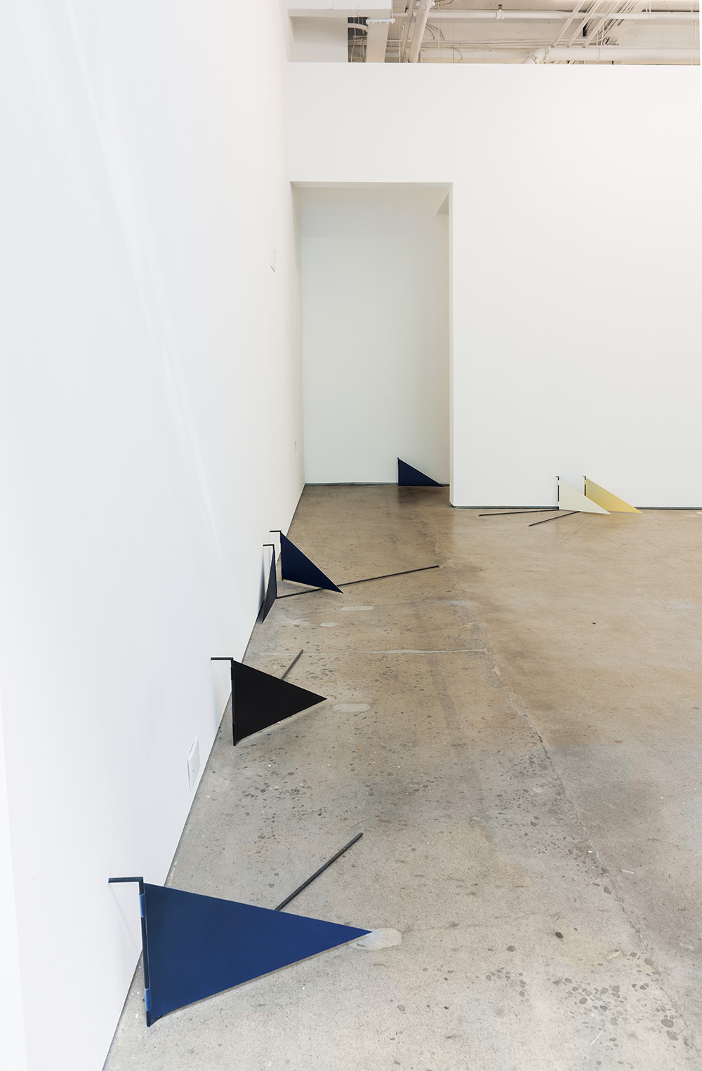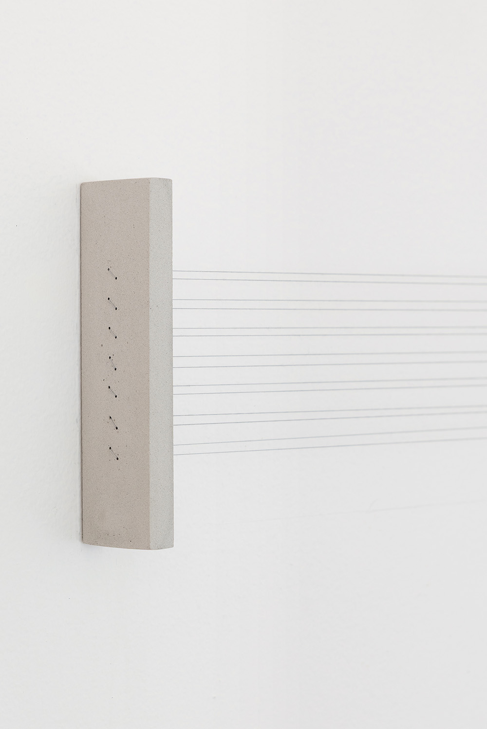 Untitled (sails) are floor-based sculptures made from aluminum, brass, paint, charcoal powder, graphite powder, and fiberglass. Triangles set on a vertical axis, they evoke a sundial, a cast shadow, a flag, or the edge of a door held ajar. Untitled (trace), comprised of cement, hand-worked thread, and brass, reads like a poetic stanza; its lines extending across walls like a musical staff, strings of an instrument, a stretch of sky, or the movement of blinds. Untitled (figure), made of carved plaster, implies a vent — the lungs of a room mid-breath.