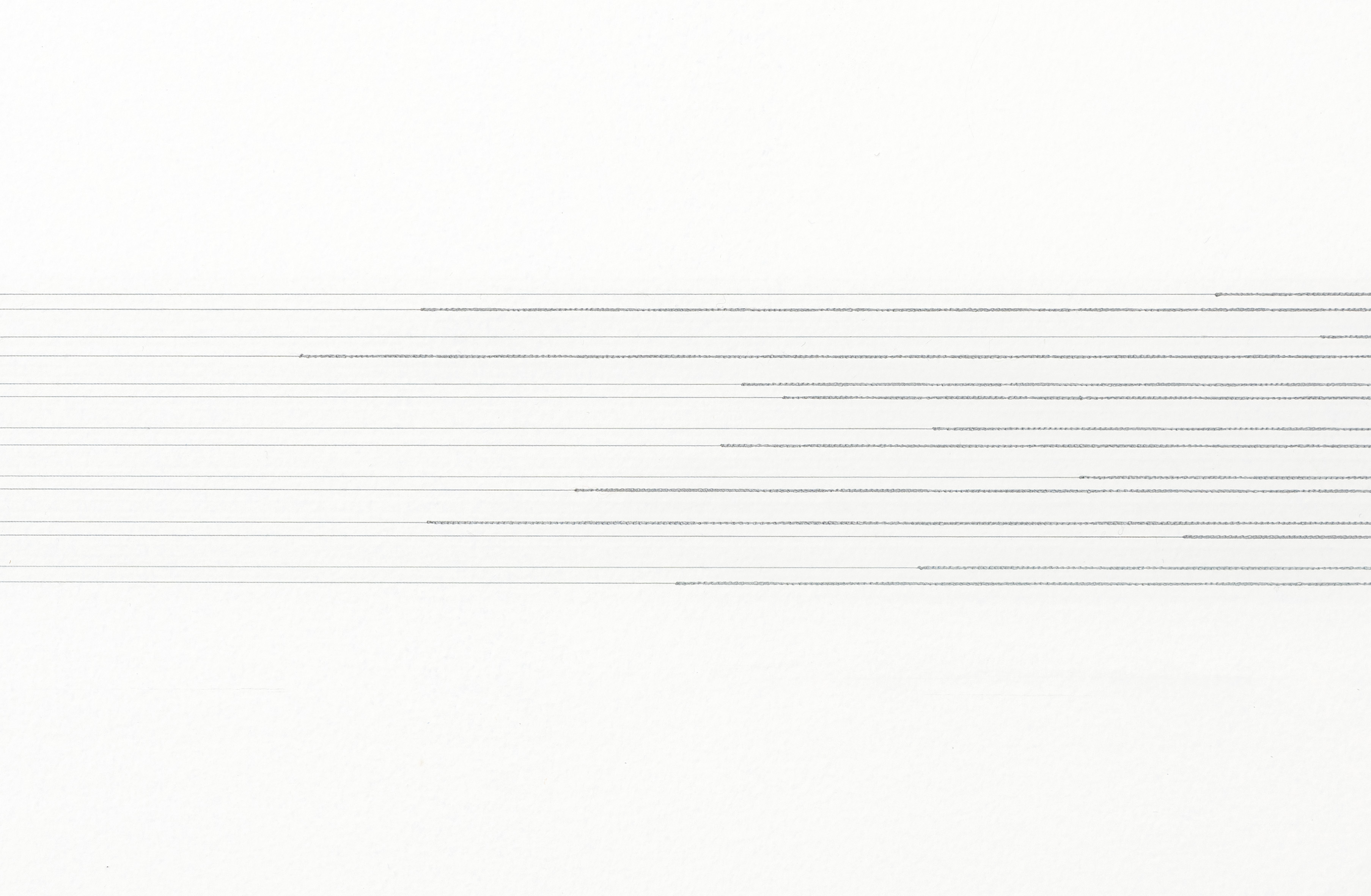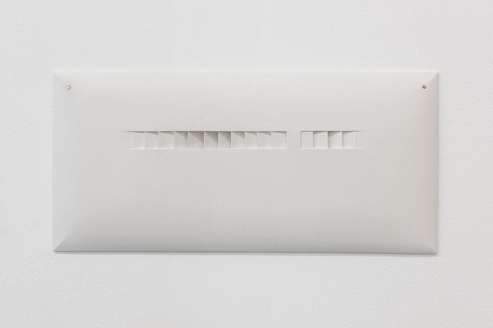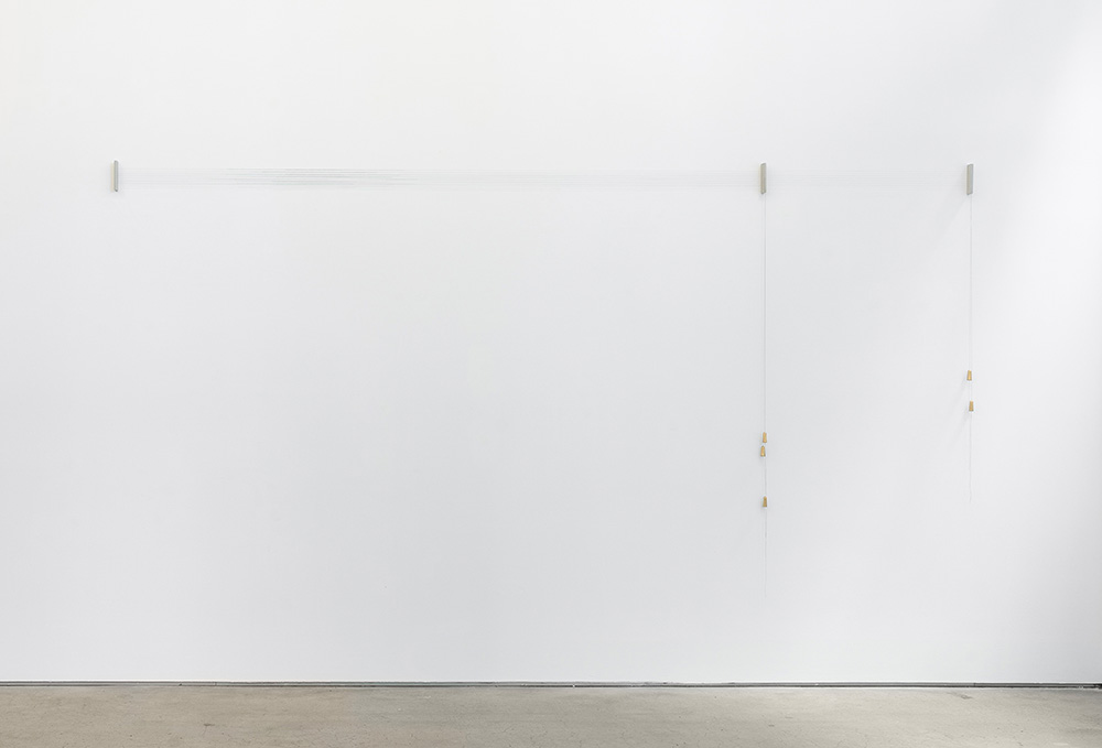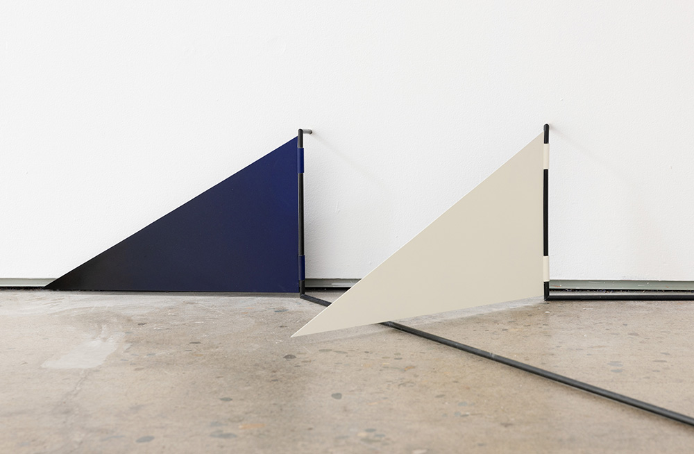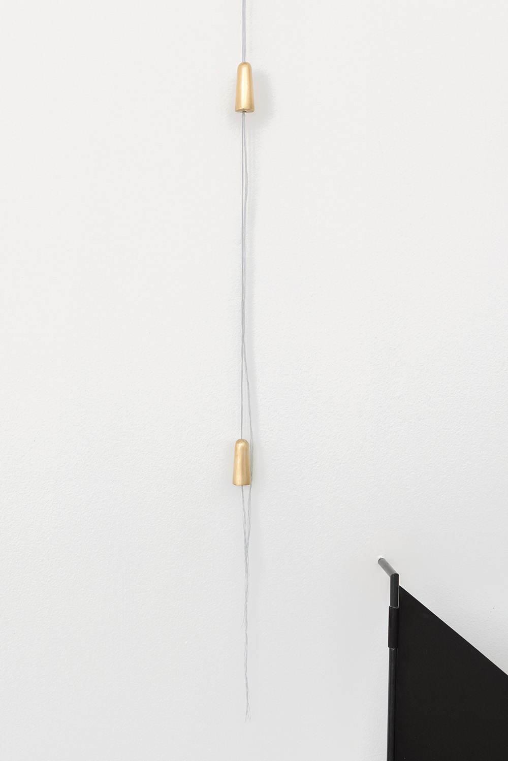 Untitled (sails) are floor-based sculptures made from aluminum, brass, paint, charcoal powder, graphite powder, and fiberglass. Triangles set on a vertical axis, they evoke a sundial, a cast shadow, a flag, or the edge of a door held ajar. Untitled (trace), comprised of cement, hand-worked thread, and brass, reads like a poetic stanza; its lines extending across walls like a musical staff, strings of an instrument, a stretch of sky, or the movement of blinds. Untitled (figure), made of carved plaster, implies a vent — the lungs of a room mid-breath.
